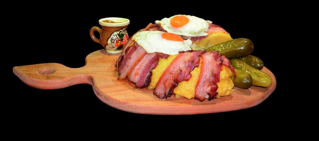 Mămăliga fierbinte înmoaie brânza și o încâlzește în acelaș timp. La acest amestec s-au adăugat în timp cârnați prăjiți în untură și ținuți în putini de lemn peste iarnă, costiță dar și ouă ochiuri.